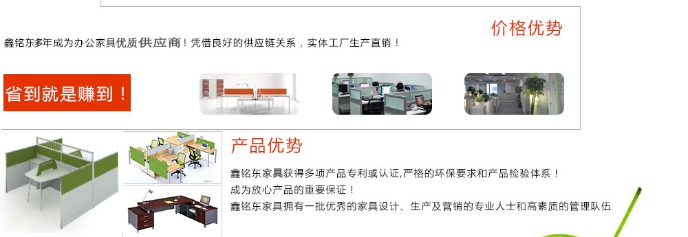 深圳市鑫銘東家具有限公司專業(yè)銷售各類辦公家具!產(chǎn)品涉及多種系列,如:班臺(tái)、班椅、屏風(fēng)、會(huì)議桌、會(huì)議椅、辦公沙發(fā)、茶幾、辦公桌、文件柜、電腦桌椅、各式餐臺(tái)、餐椅、書柜等辦公家具。 鑫銘東家具擁有一批優(yōu)秀的家具設(shè)計(jì)、生產(chǎn)及營(yíng)銷的專業(yè)人士和高素質(zhì)的管理隊(duì)伍。銘東家具以"先難后易"之戰(zhàn)略,在產(chǎn)品結(jié)構(gòu)、產(chǎn)品質(zhì)量及服務(wù)水平方面,均推陳出新,力求完善,精益求精。使我們的產(chǎn)品質(zhì)量保持在國(guó)內(nèi)外家具潮流的先進(jìn)水平,力求滿足客戶的特殊需求。鑫銘東家具多年來(lái)致力于環(huán)保、實(shí)用家具的設(shè)計(jì)與開(kāi)發(fā),集生產(chǎn)、銷售、服務(wù)于一體。本著"以人為本"的設(shè)計(jì)理念,大量開(kāi)發(fā)符合人體工程學(xué)的各種產(chǎn)品,以"誠(chéng)信為本"的質(zhì)量方針,真材實(shí)料,認(rèn)認(rèn)真真做產(chǎn)品,實(shí)實(shí)在在做人。鑫銘東家具更致力于創(chuàng)造"零維修率"的制造境界,實(shí)現(xiàn)"沒(méi)有維修的服務(wù)才是最好服務(wù)"的口號(hào)》了解更多